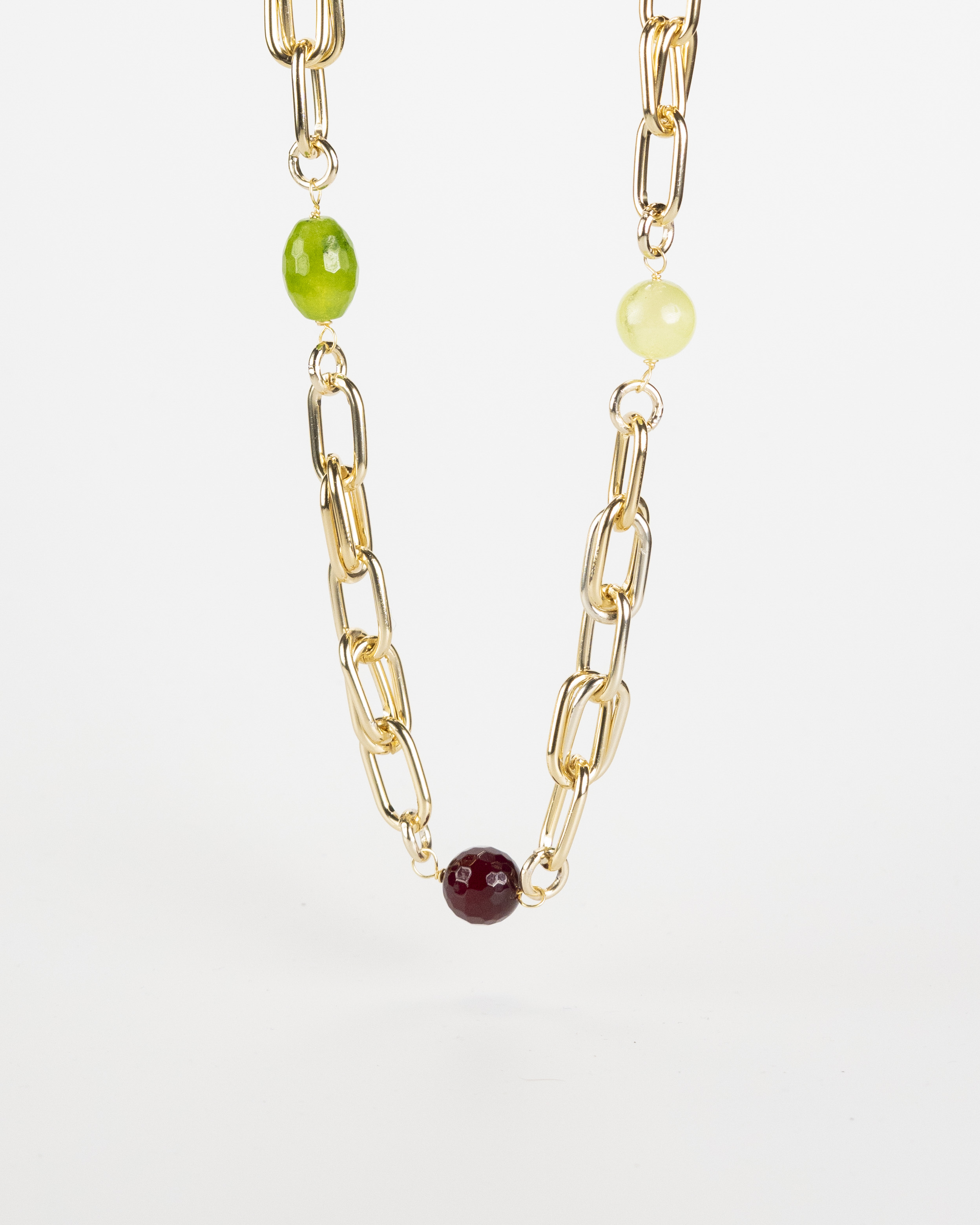 Esplora l’eleganza naturale della nostra collana, realizzata con giada e agata amarena, abbinata con un sostegno in alluminio dorato. Questo gioiello incarna la fusione unica tra la bellezza naturale delle pietre preziose e l’eleganza luminosa dell’alluminio dorato. La giada e l’agata amarena aggiungono una nota di colore e raffinatezza, mentre l’alluminio dorato dona un tocco di lusso sottile. Indossalo per un look sofisticato e distintivo che riflette la tua personalità unica.