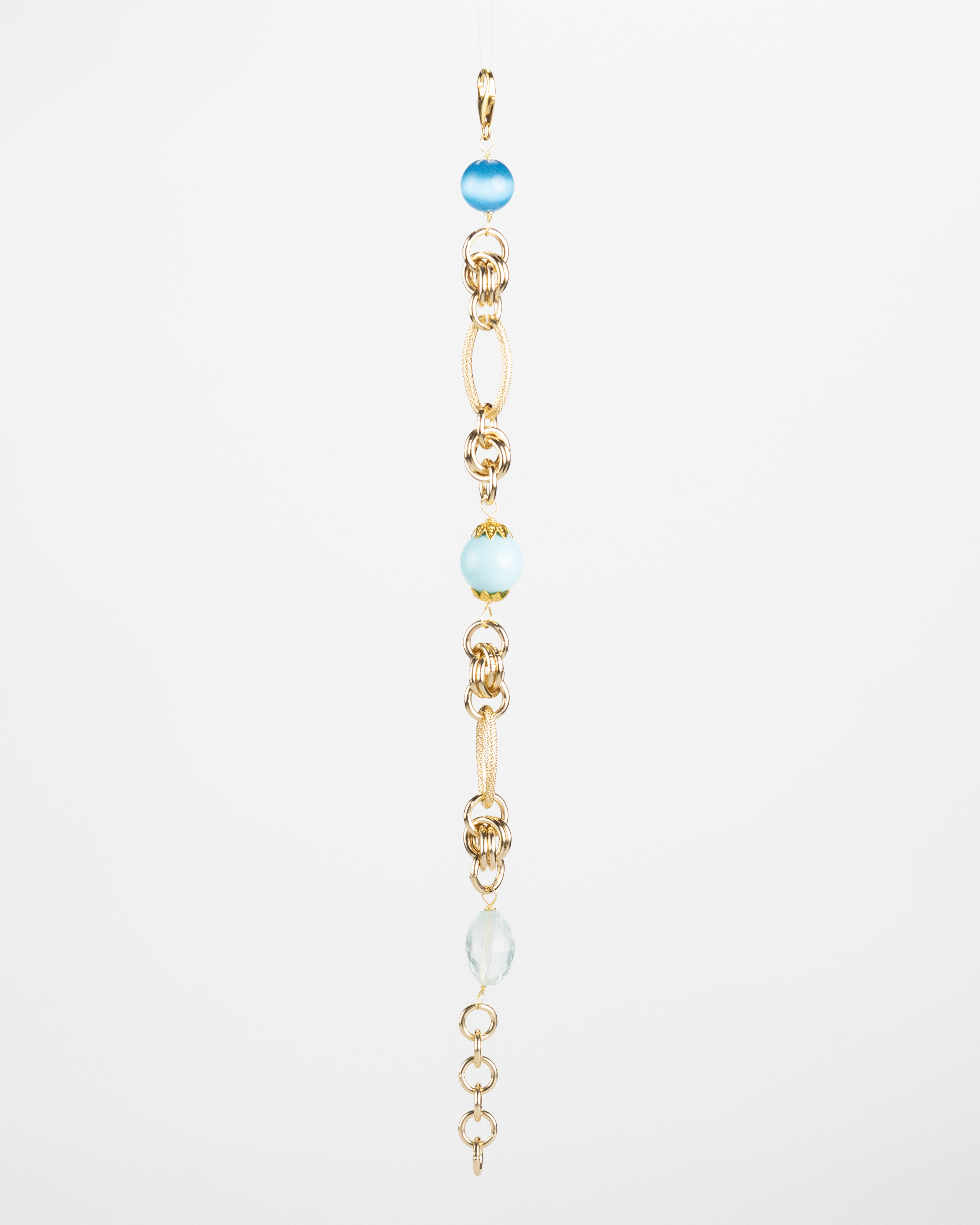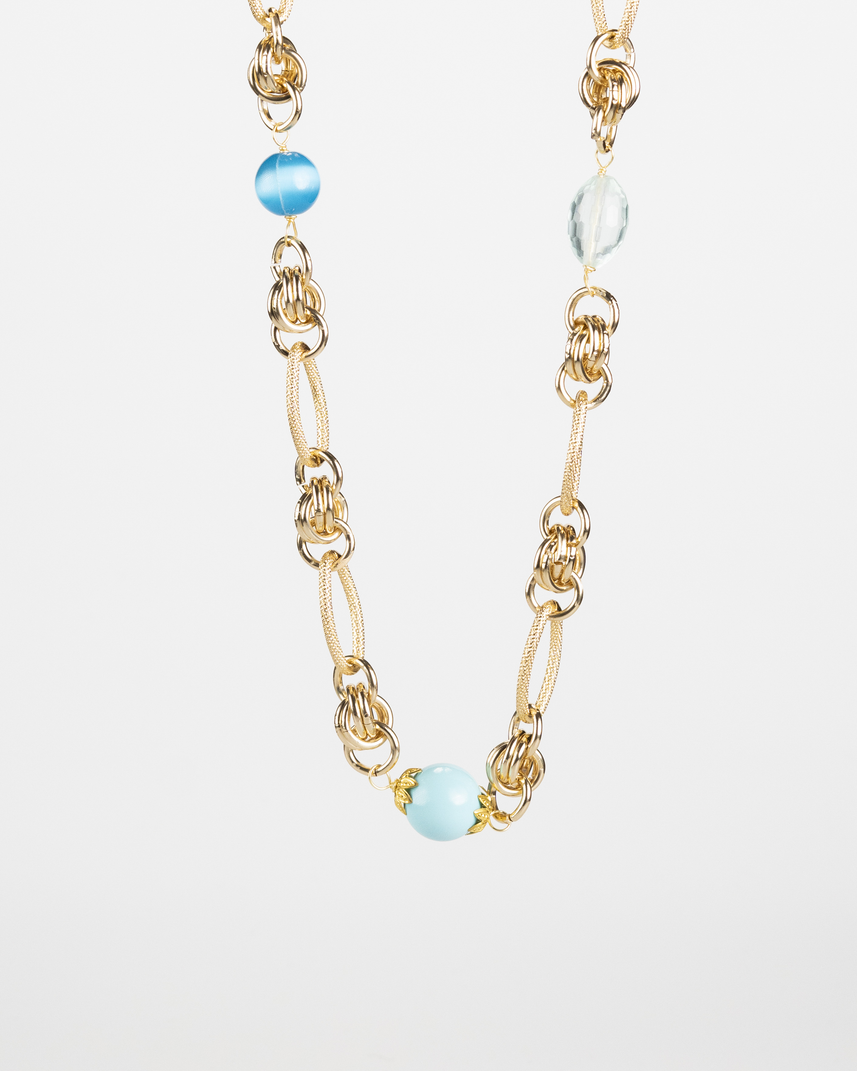 Scoprite l’arte dell’eleganza con la nostra collana in alluminio dorato, impreziosita da occhio di gatto, giada e topazio azzurro, simbolo di stile e artigianato moderno. L’occhio di gatto cattura la luce, creando un effetto magico, mentre la giada aggiunge equilibrio e serenità. Il topazio azzurro evoca la freschezza dell’acqua, completando l’opera con una doratura che unisce il lusso dell’oro alla modernità del design. Un gioiello non solo da indossare, ma da vivere, che parla al vostro spirito con la sua bellezza unica.