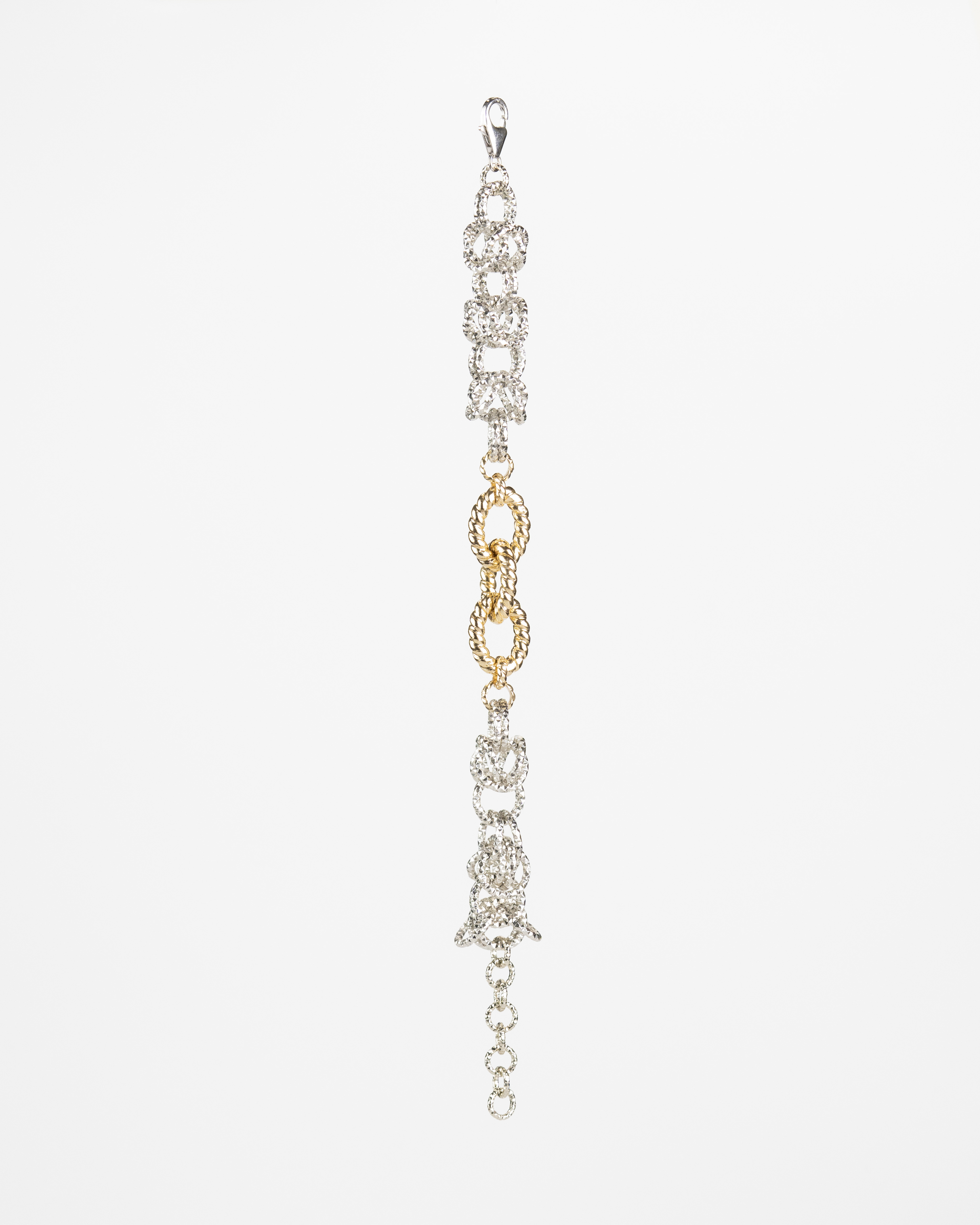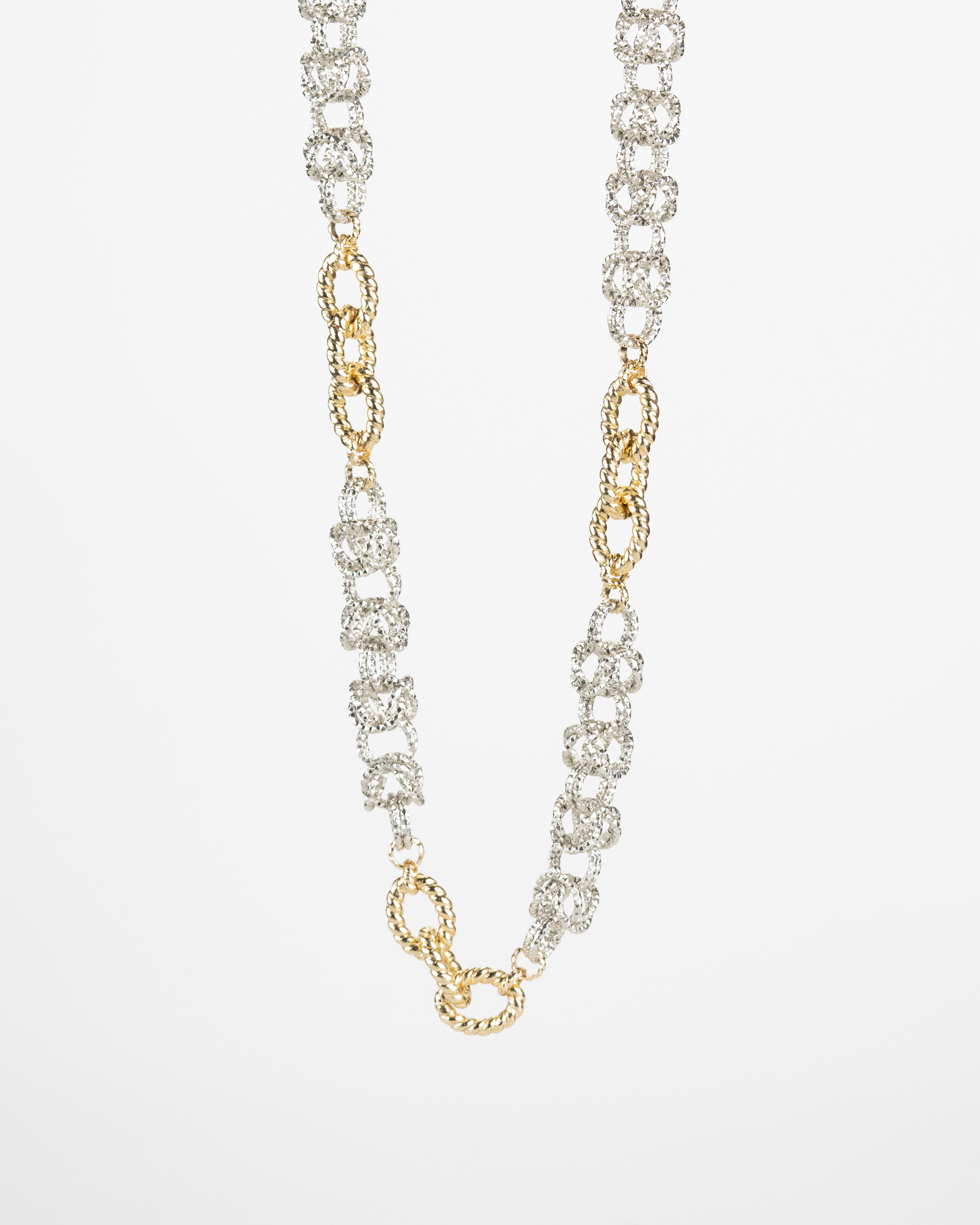 Scoprite l’arte del design con il nostro girocollo, un’espressione di artigianato moderno realizzata in alluminio bianco e dorato. Questo gioiello non è solo un accessorio, ma un simbolo di stile senza tempo e maestria artigianale. La maglia bizantina, abbinata alla maglia ovale elicoidale, crea un effetto visivo straordinario, invitando gli amanti dell’eleganza a farla propria e a lasciare che la sua bellezza unica parli al loro spirito. L’alluminio bianco e dorato offre un contrasto affascinante che cattura l’occhio, rendendo questo girocollo un pezzo centrale di qualsiasi collezione.